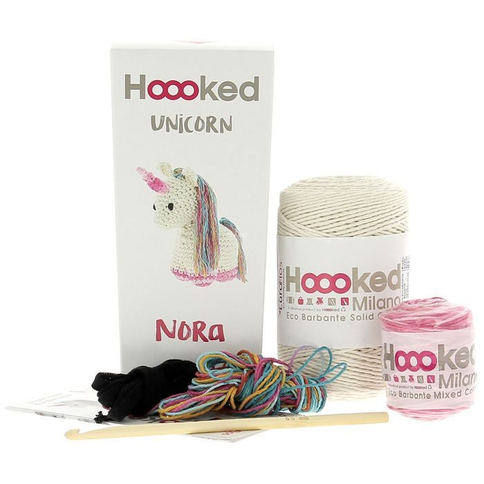 Cette adorable licorne fera le bonheur des enfants ! Cet amigurumi est à crocheter avec du fil Hoooked 85% coton et 15% de fil recyclé coton Eco Barbante. Un cadeau rigolo et fait main, qui sera certainement apprécié par vos proches. Le kit licorne contient les fils, le crochet bambou n°6, les explications et un mètre de fil noir pour les yeux et les fils pour la crinière.
