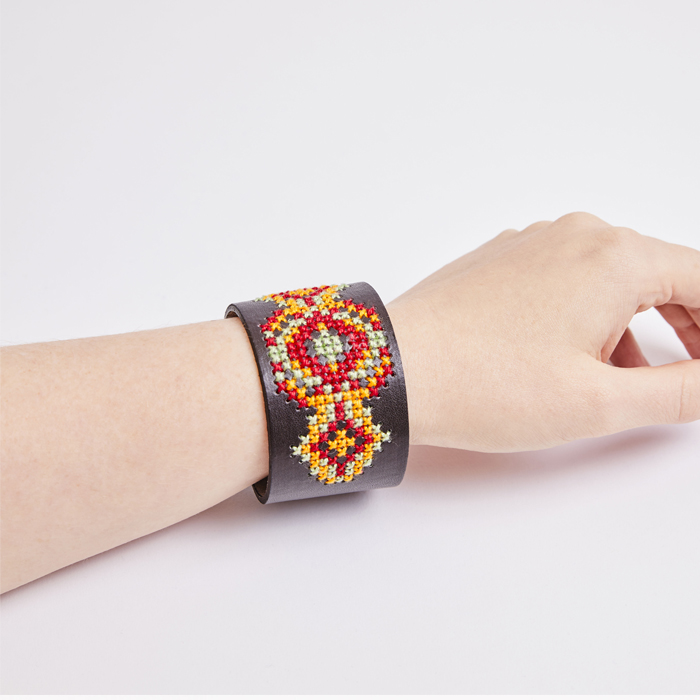 Bracelet à personnaliser avec du fil Perlé. En simili cuir de 21.5 cm sur 4 cm de large, épaisseur 2mm, réglable avec 2 boutons pressions. Fil non inclus.